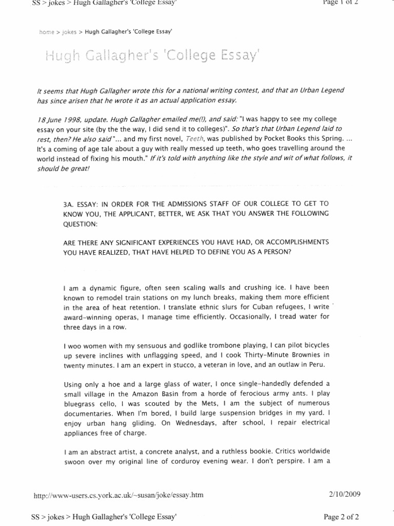 · Polski Impressum 19/07/ · The essay was written in by high school student Hugh Gallagher. He graduated from NYU in May He allegedly used it to get into NYU and graduated from the university in Hugh gallagher college admission essay Brazil film d essay Gallagher ‘s Essay: I am a dynamic figure, often seen scaling walls and crushing ice. I have been known to remodel train stations on my lunch breaks, making them more efficient in the area of heat retention. I translate ethnic slurs for Cuban refugees, I write award-winning operas, I manage time efficiently · That's Hugh Gallagher College Application Essay why we have entry tests Hugh Gallagher College Application Essay for all applicants who want to work for us. Our paper writers are able to help you with all kinds of essays, including application essays, persuasive essays, and so on. Every essay writer is highly qualified and fully capable of completing Critical Film Analysis Essay